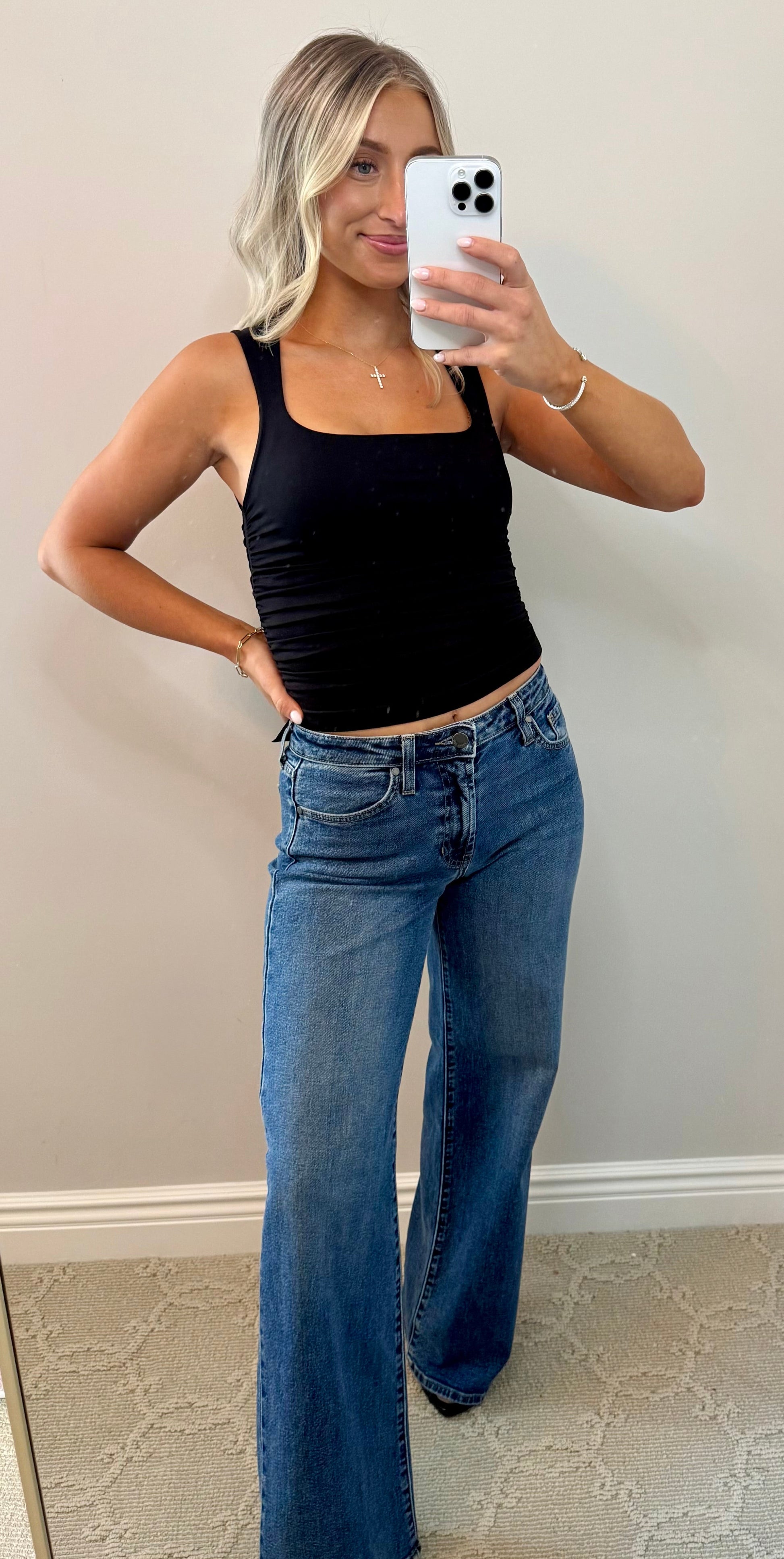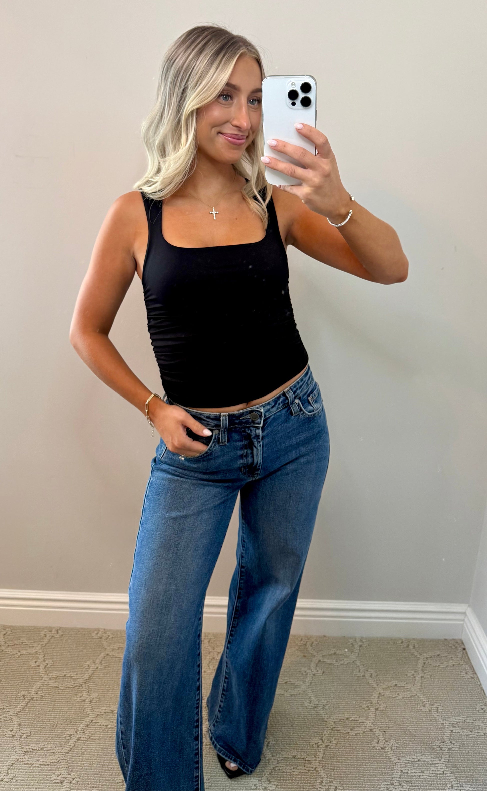 -Enhanced with shirred details, clean square neck top, great everyday basic, can dress up or down